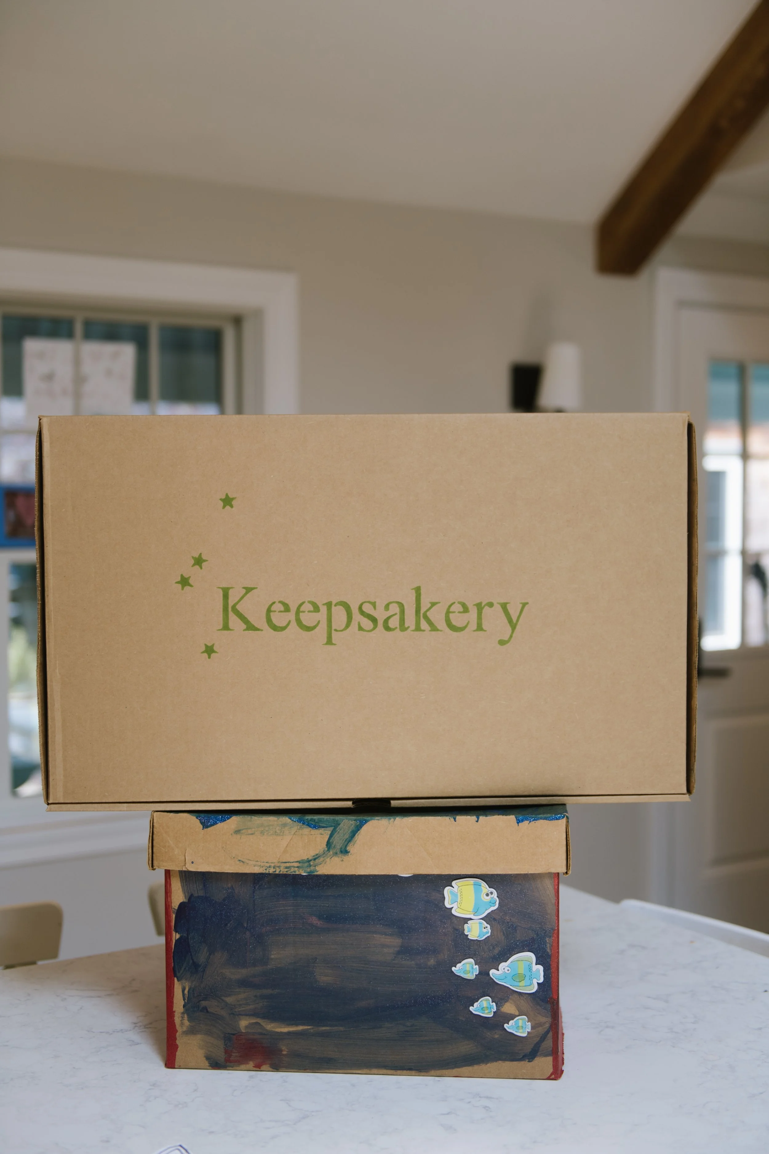 Instead of letting artwork float around in random piles (aka: the kitchen counter), give it a dedicated home. A simple lidded box or storage bin works well. I keep one box for each child and toss in anything I want to save throughout the year. Later, I sort through and keep the best pieces. Or another idea- order a Keepsakery Box and hold onto it until you're ready to make a book.