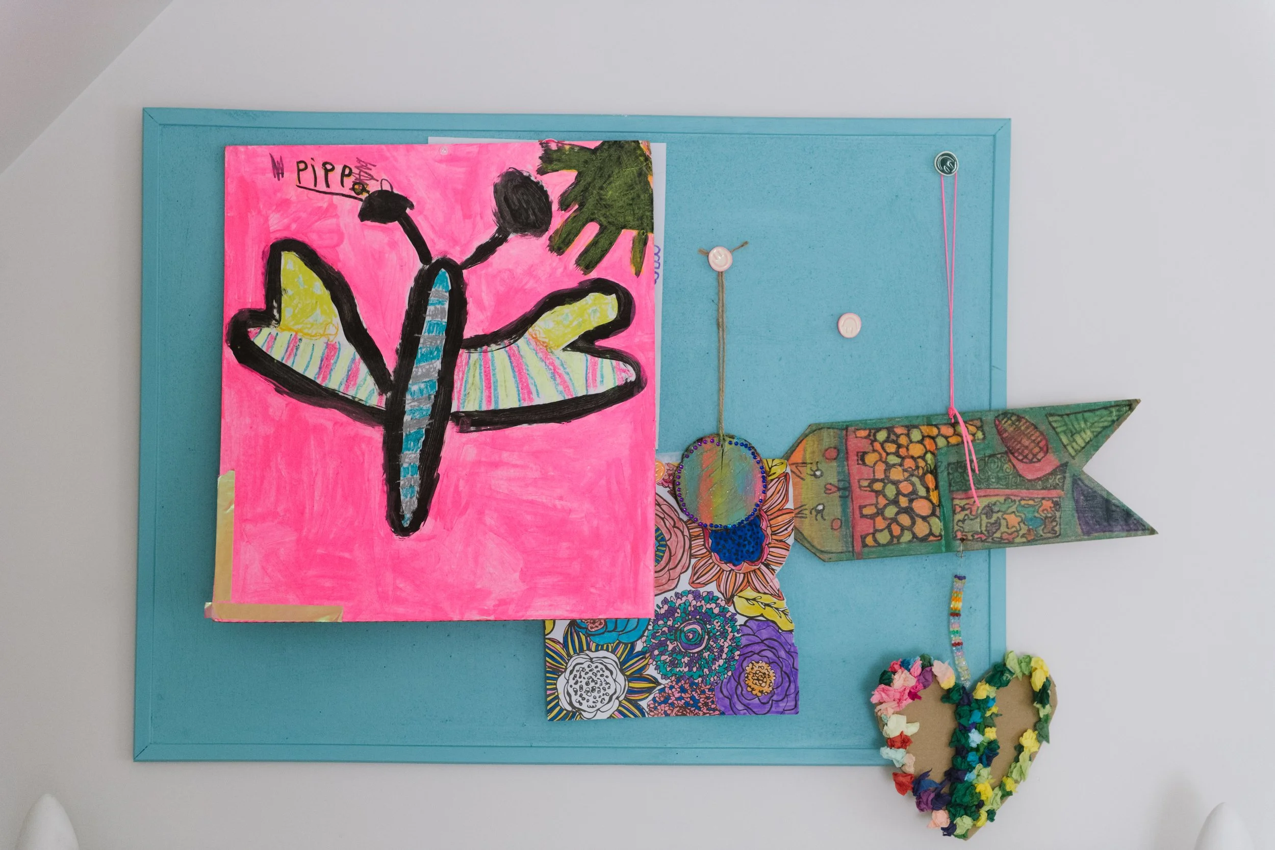 Kids artwork in simple white frames, no mat